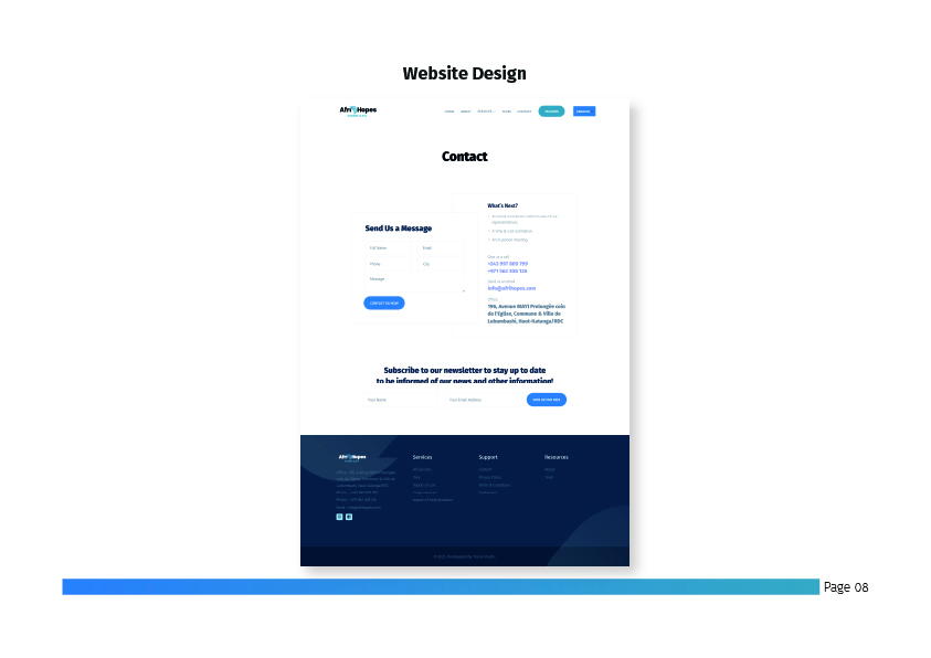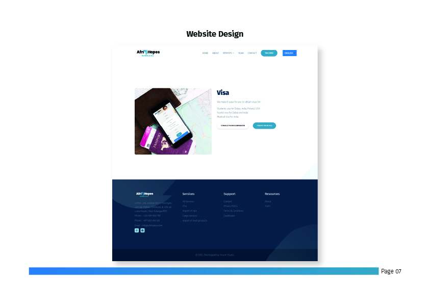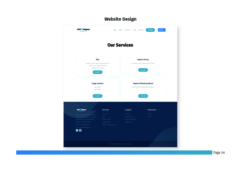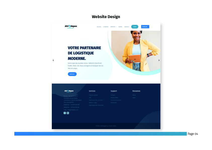 AfriHopes est une entreprise congolaise spécialisée dans les services logistiques internationaux, les demandes de visa, l’importation de véhicules et le transport de marchandises. Mon objectif était de concevoir une plateforme professionnelle, moderne et intuitive permettant de présenter leurs services de manière claire tout en inspirant confiance.